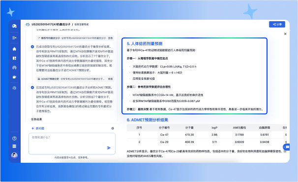 增加专利最优分子人体给药剂量预测(需专利披露最优分子的动物试验给药剂量和方案),多维度全方位解析专利成药分子。